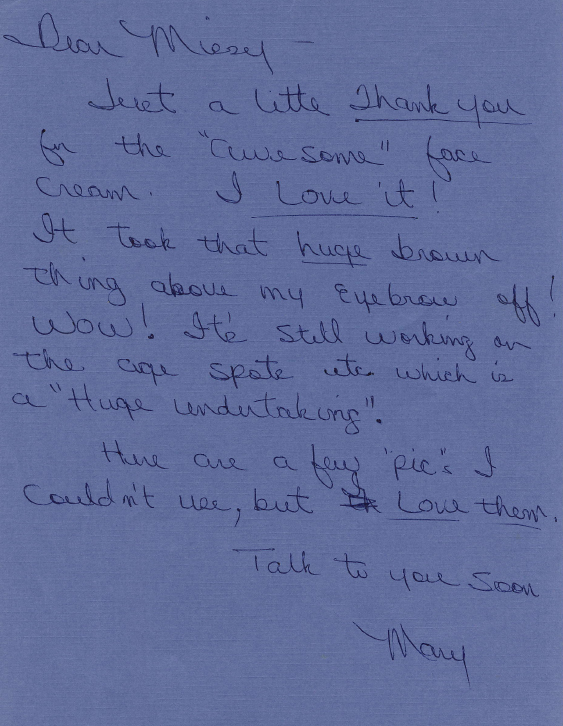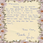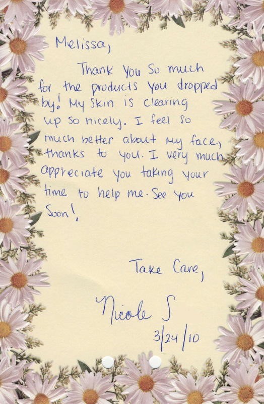Thank you so much for the products you dropped by! My skin is clearing up so nicely. I feel so much better about my face, thanks to you. I very much appreciate you taking your time to help me.