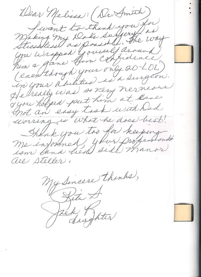 I want to thank you for making my dad’s surgery as stress less as possible, the way you wrapped yourself around him and gave him confidence in your abilities as a surgeon.