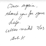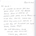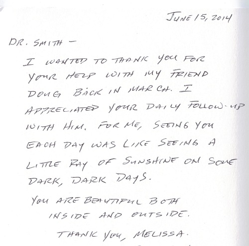 I wanted to thank you for your help with my friend Doug back in March. I appreciated your daily follow-up with him. For me, seeing you each day was like seeing a little ray of sunshine on some dark, dark days.