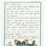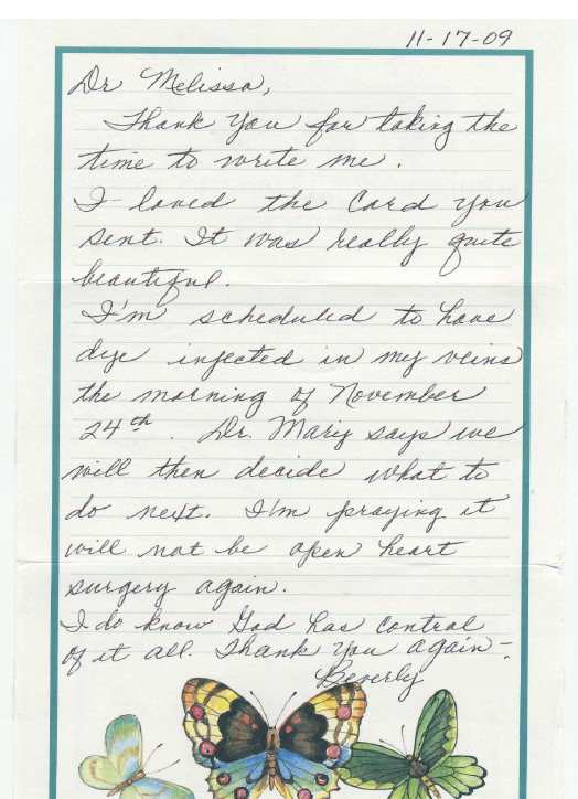 Thank you for taking the time to write me. I loved the card you sent. It was really quite beautiful. I’m scheduled to have dye injected in my veins the morning of November 24th. Dr. Mary says we will then decide what to do next. I’m praying it will not be open heart surgery again.