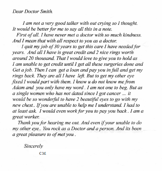 I quit my job of 30 years to get this care I have needed for years and all I have is great credit and 2 nice rings worth around 20 thousand that I would love to give you to hold as I am unable to get credit until I get all these surgeries done and get a job. Then I can get a loan and pay you in full and get my rings back. They are all I have left but to get my other eye fixed I would part with them. I know you do not know me from Adam and you only have my word. I am not one to beg, but as a single woman who has not dated since I got cancer… it would be so wonderful to have 2 beautiful eyes to go with my new chest. If you are unable to help me I understand. I had to at least ask. I would even work for you to pay you back. I’m a great worker.