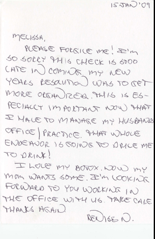 Please forgive me! I’m so sorry this check is so late in coming, my new year resolution was to get more organized. This is especially important now that I have to manage my husband’s office / practice. That whole endeavor is going to drive me to drink!